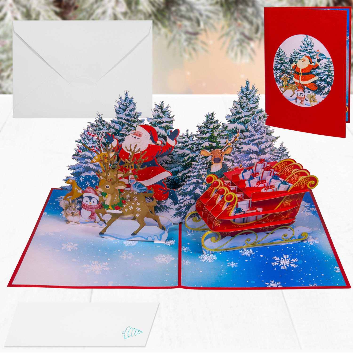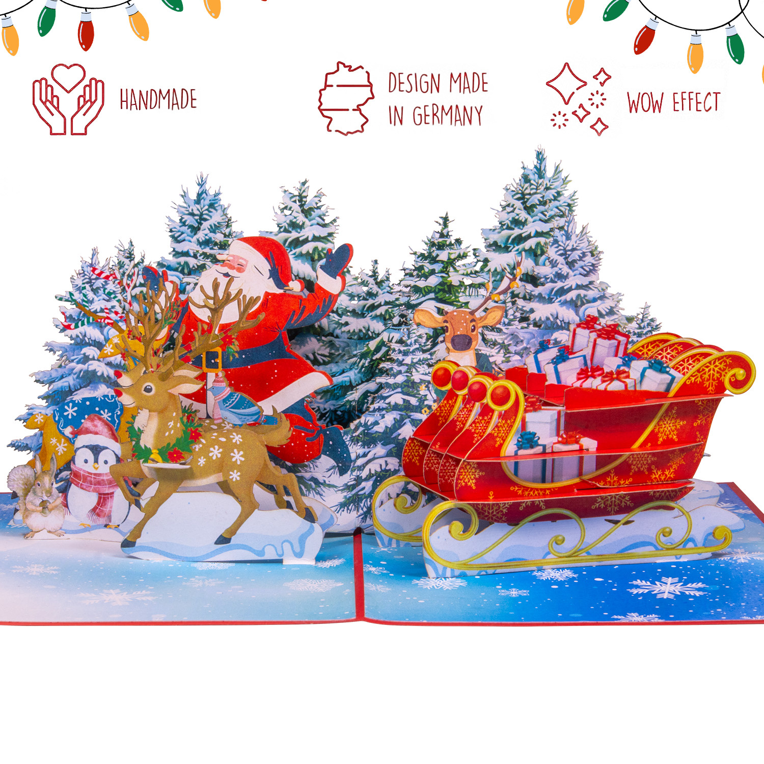 LINPOPUP® Weihnachtskarte 3D – Handgemachte Pop-Up Karte mit Weihnachtsmotiv – Grußkarte mit Umschlag – Geschenkidee zu Weihnachten, Weihnachtsmann Nikolaus im Wald mit Rentiere & Schlitten , N466
